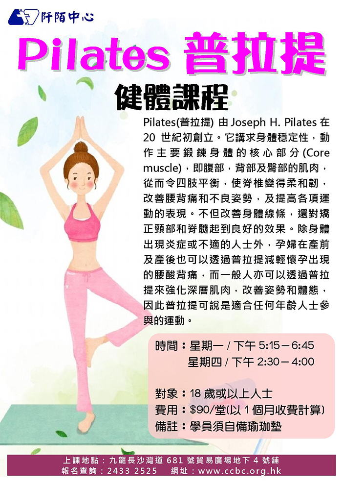 Pilates(普拉提) 由Joseph H. Pilates在20世紀初創立。它講求身體穩定性,動作主要鍛鍊身體的核心部分(Core muscle),即腹部,背部及臀部的肌肉,從而令四肢平衡,使脊椎變得柔和韌,改善腰背痛和不良姿勢,及提高各項運動的表現。不但改善身體線條,還對矯正頸部和脊髓起到良好的效果。除身體出現炎症或不適的人士外,孕婦在產前及產後也可以透過普拉提減輕懷孕出現的腰酸背痛,而一般人亦可以透過普拉提來強化深層肌肉,改善姿勢和體態,因此普拉提可說是適合任何年齡人士參與的運動。